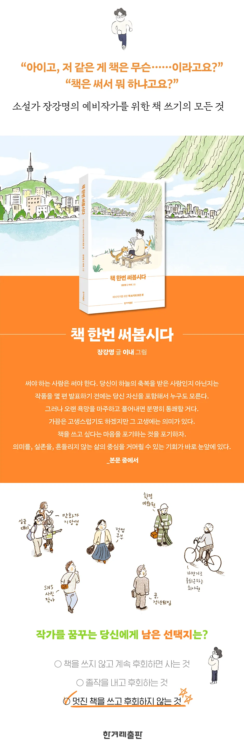 책 한 권은커녕 짧은 인터넷 기사조차 읽기 버거운 시대다. SNS의 짧은 글과 유튜브 동영상이 글자를 대체하는 시대다. 출판 시장은 갈수록 위축되어가지만, 인스타그램의 예쁜 사진들을 모은 화보집은 베스트셀러가 되기도 하는 시대다. 그래, 맞다, 소설가 장강명의 작법 에세이인 『책 한번 써봅시다』가 출간된 것도 바로 이런 시대다.