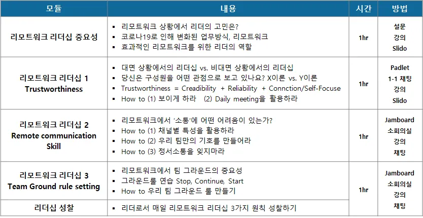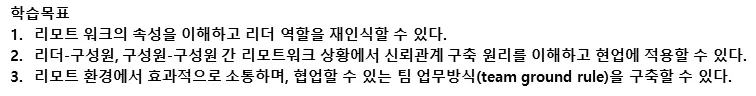 리모트 워크의 속성을 이해하고 리더 역할을 재인식할 수 있다.