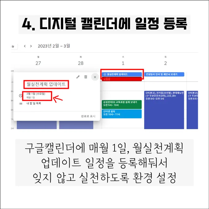 위의 3가지를 잊지 않고 실천하기 위해서 디지털캘린더에 일정을 등록해둡니다.