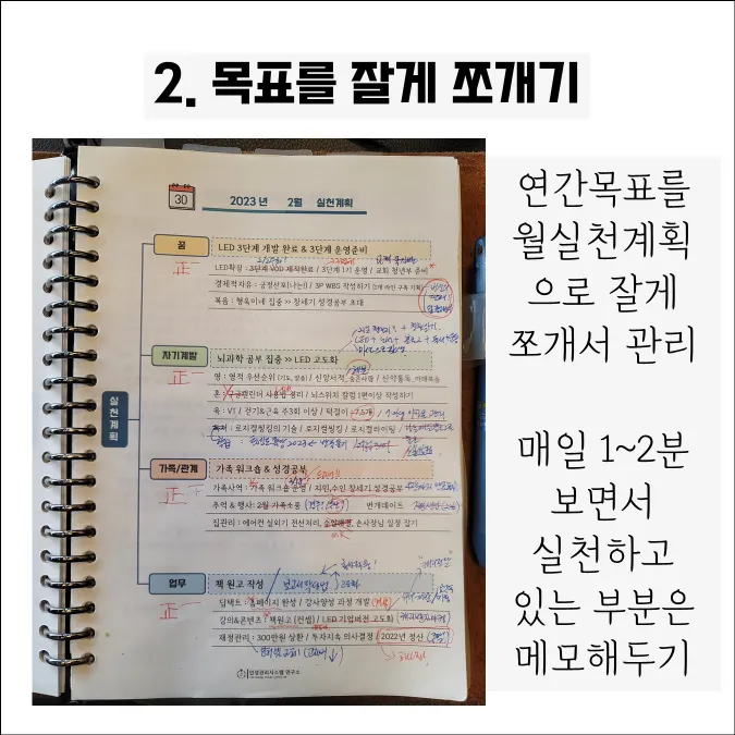 그래서 실행하기 위해서는 '월실천계획'으로 잘게 쪼개서