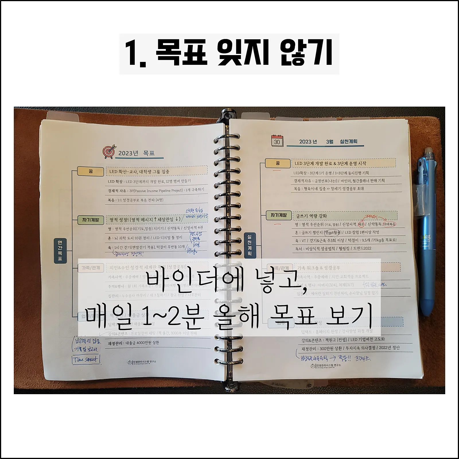 제가 실천하고 있는 인생관리시스템은 목표를 잊지 않고 계속 집중할 수 있도록 몇가지 장치를 만들었습니다.